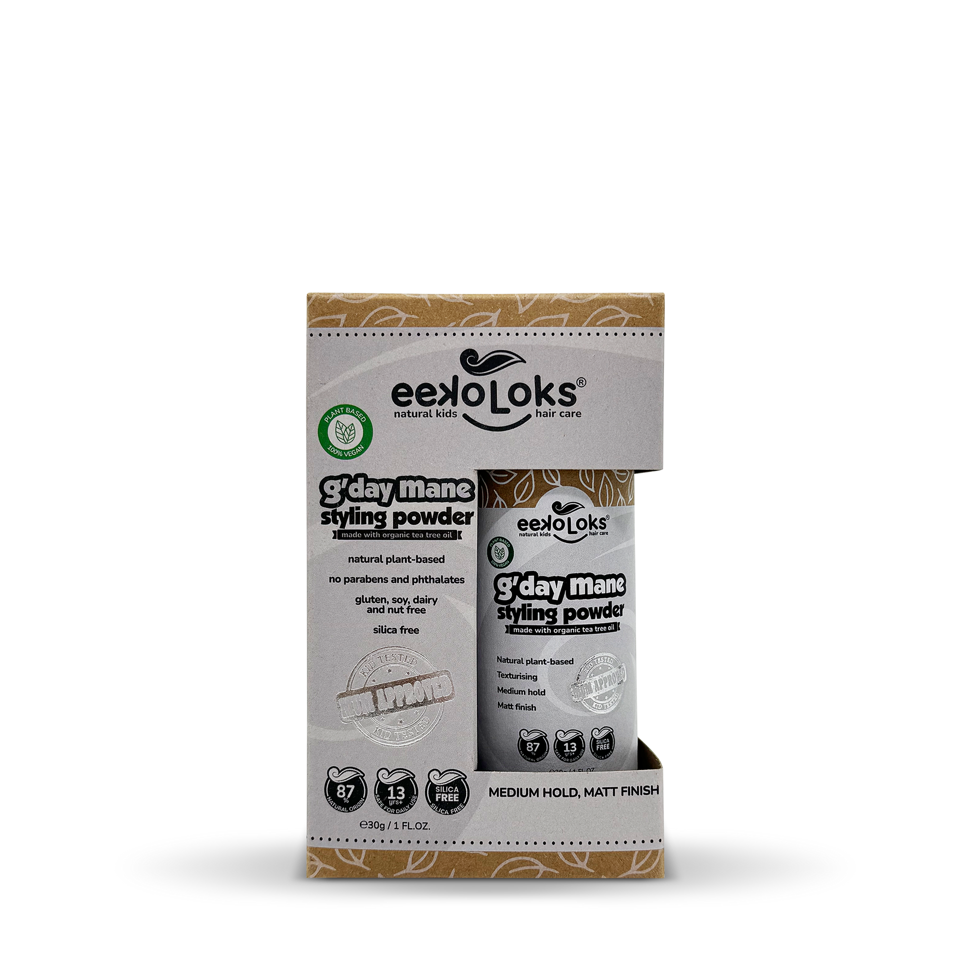 Elevate your hairstyling game with our eekoloks® G'Day Mane Styling Powder, a unique blend of natural and organic ingredients designed to give your hair the texture and volume it deserves. Perfect for all hair types, this styling powder is infused with the richness of Moroccan Lava Clay and Organic Rice Hulls, offering a lightweight hold without the heavy feel.